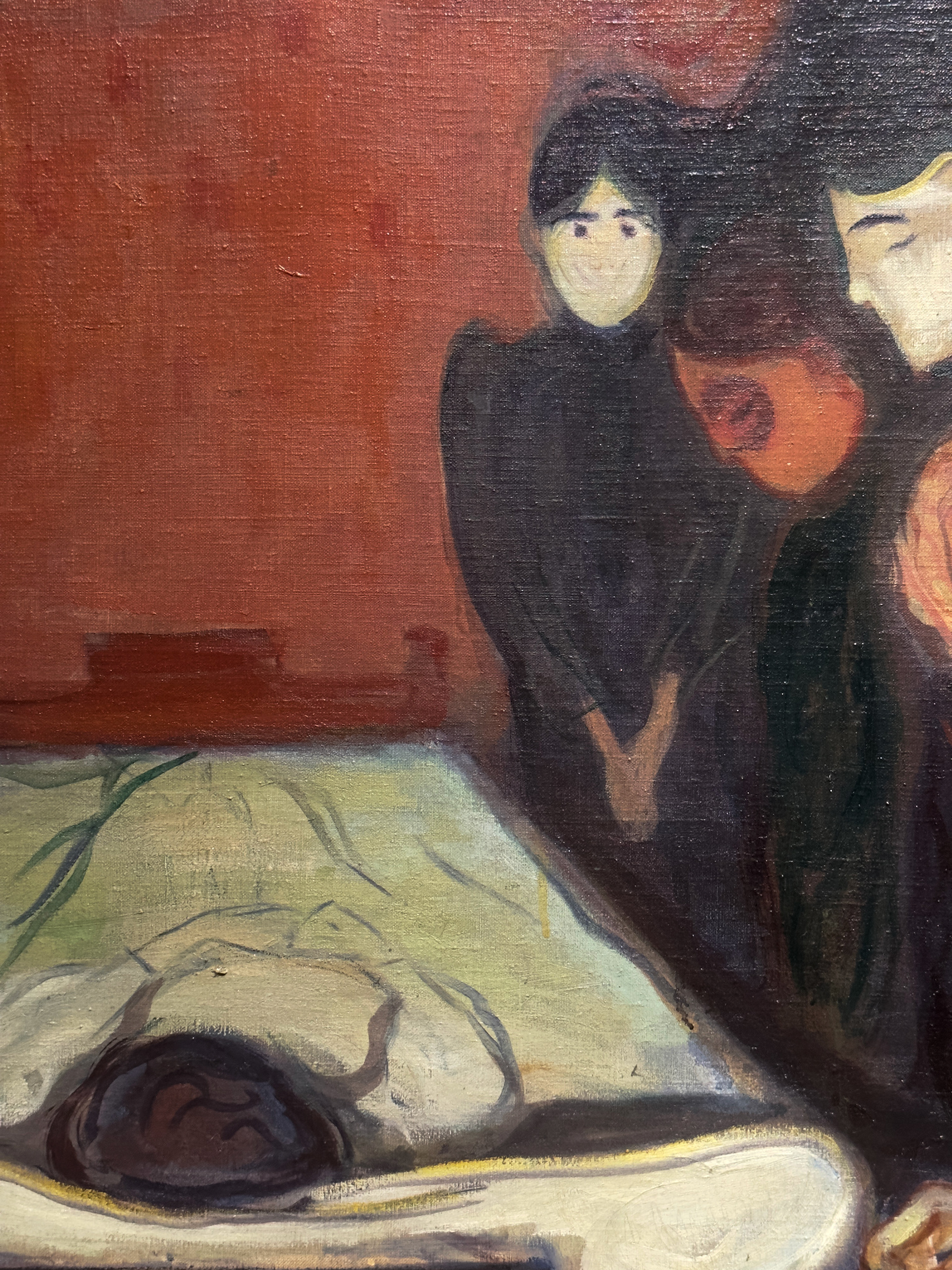 Moreover, Munch's use of muted colors conveys a sense of melancholy that permeates the scene. The palette is subdued, reflecting the somber reality of the moment, yet it also highlights moments of intimacy such as a hand touching a shoulder or a bowed head. These subtle interactions emphasize the shared support among family members, illustrating how collective mourning does not just share a burden, but also fortifies relationships against the erosive power of grief.