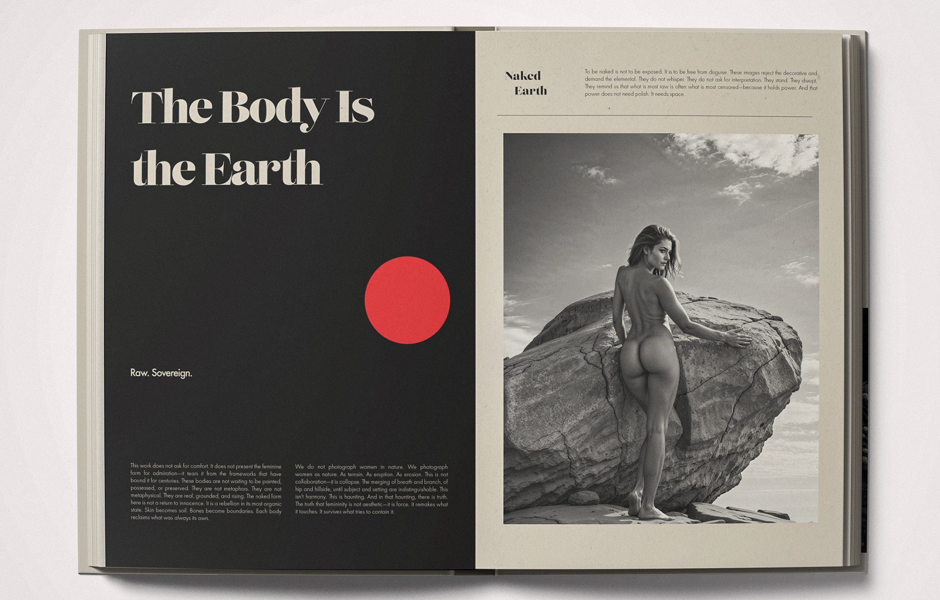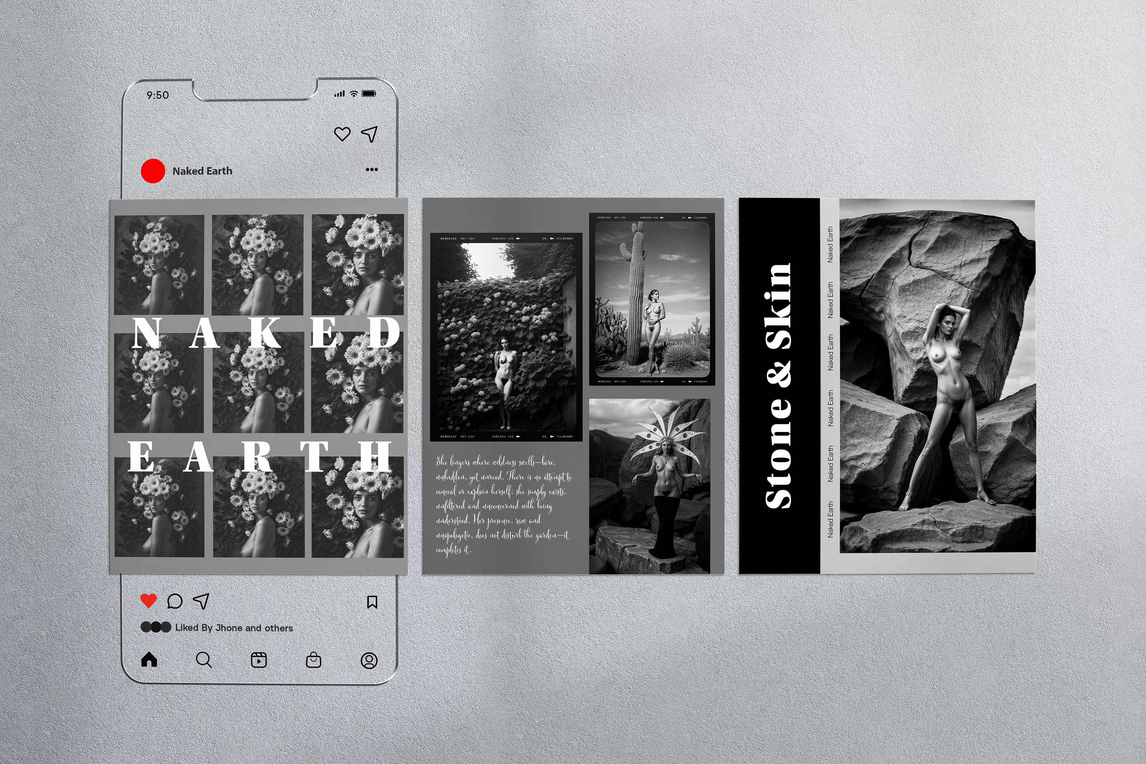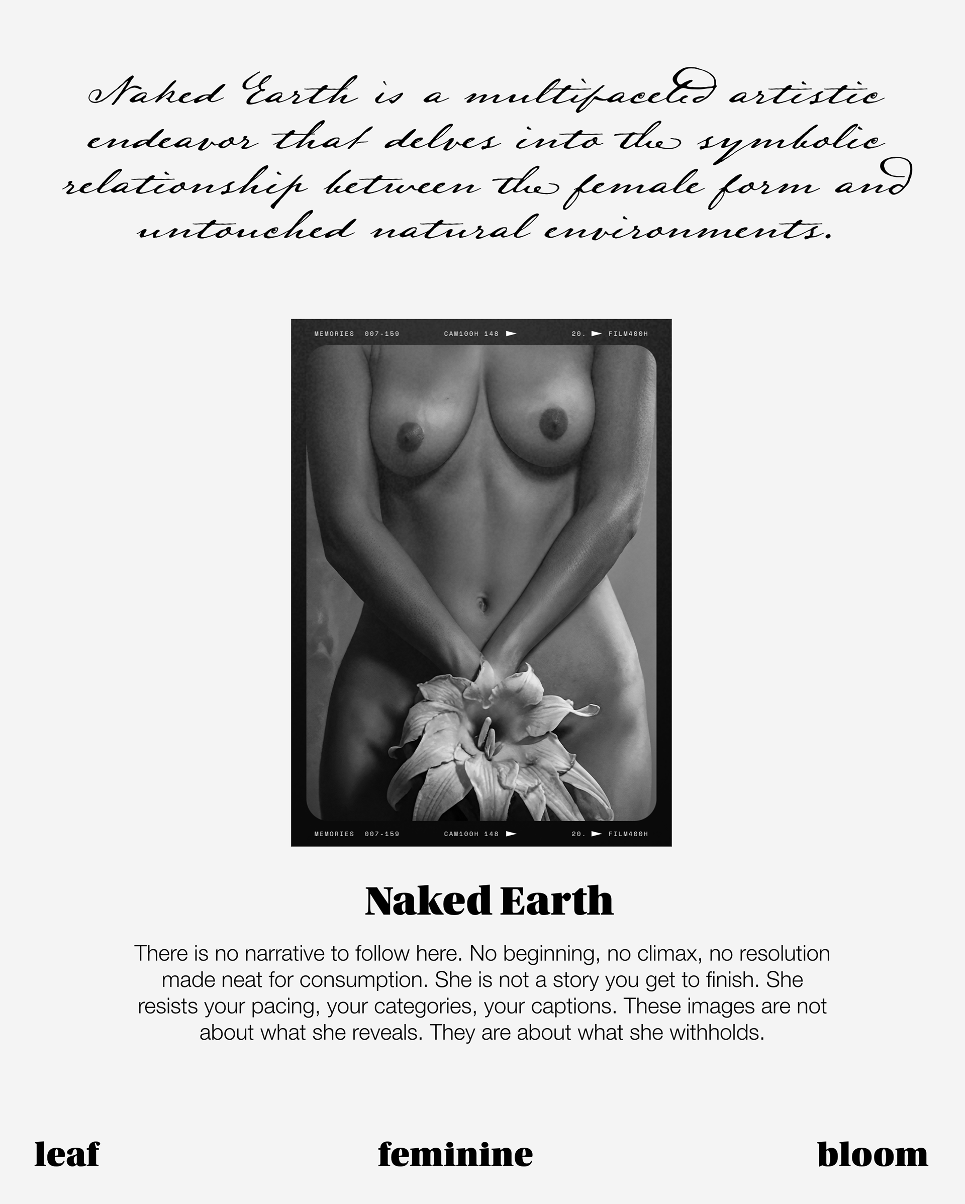 Naked Earth is a multifaceted artistic endeavor that delves into the symbolic relationship between the female form and untouched natural environments. Through a series of black and white nude art photographs, the project celebrates the raw beauty, vulnerability, and strength found at the intersection of femininity and nature. The deliverables include an art book, a comprehensive website, and a collection of print images.