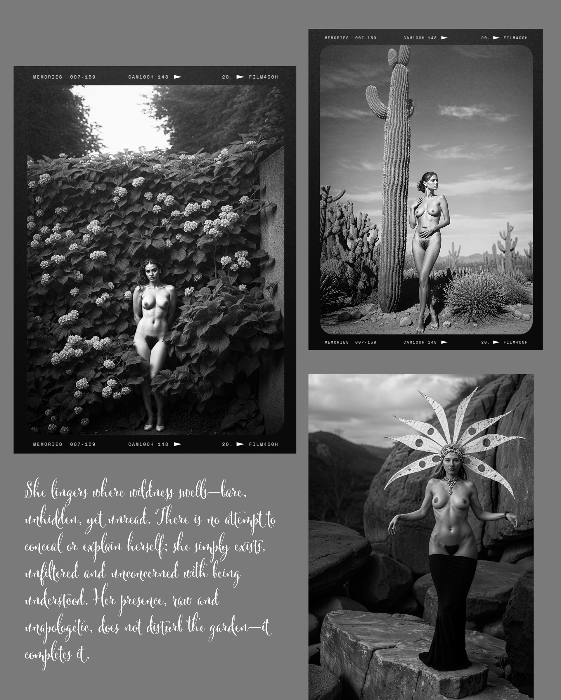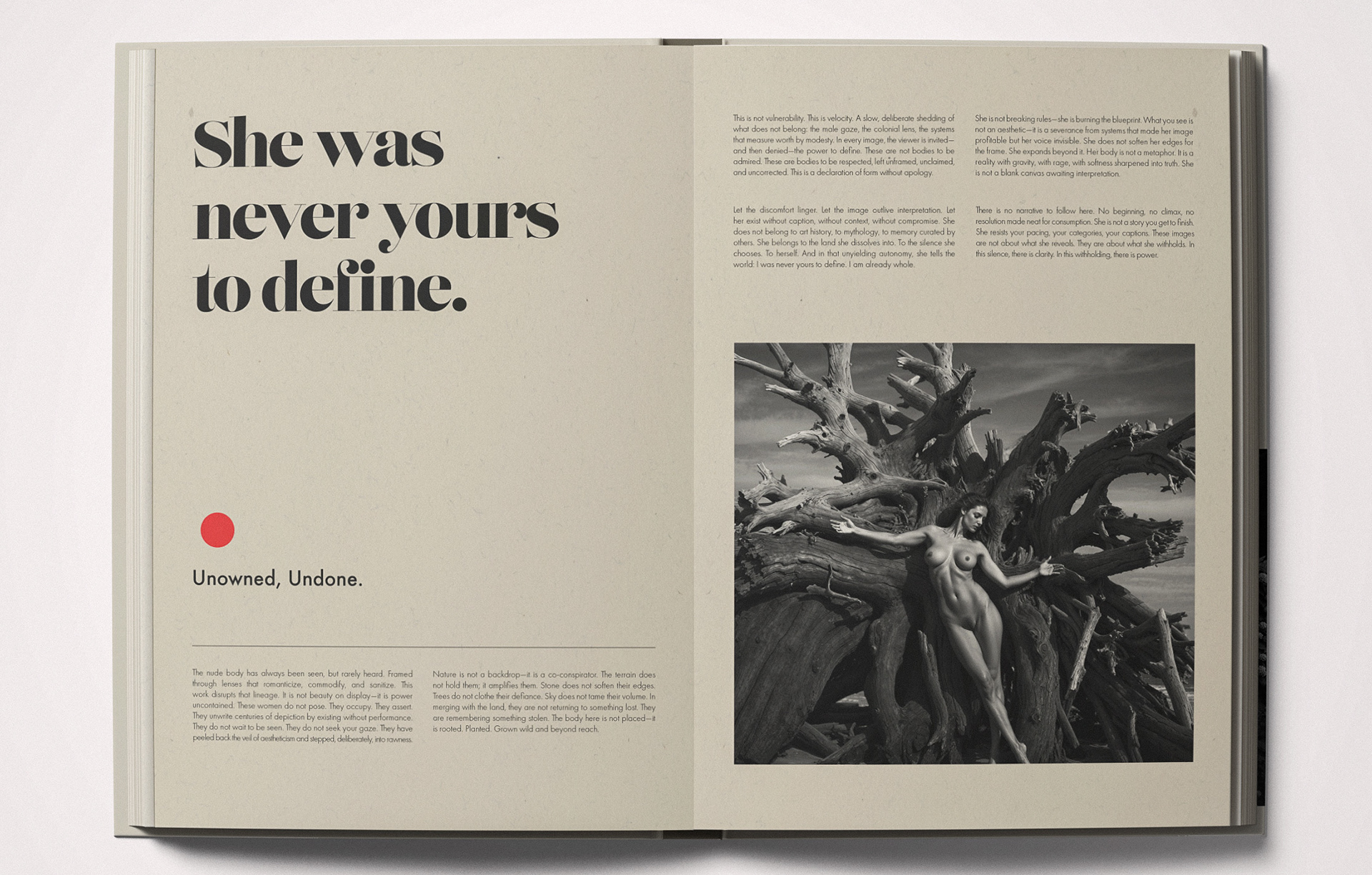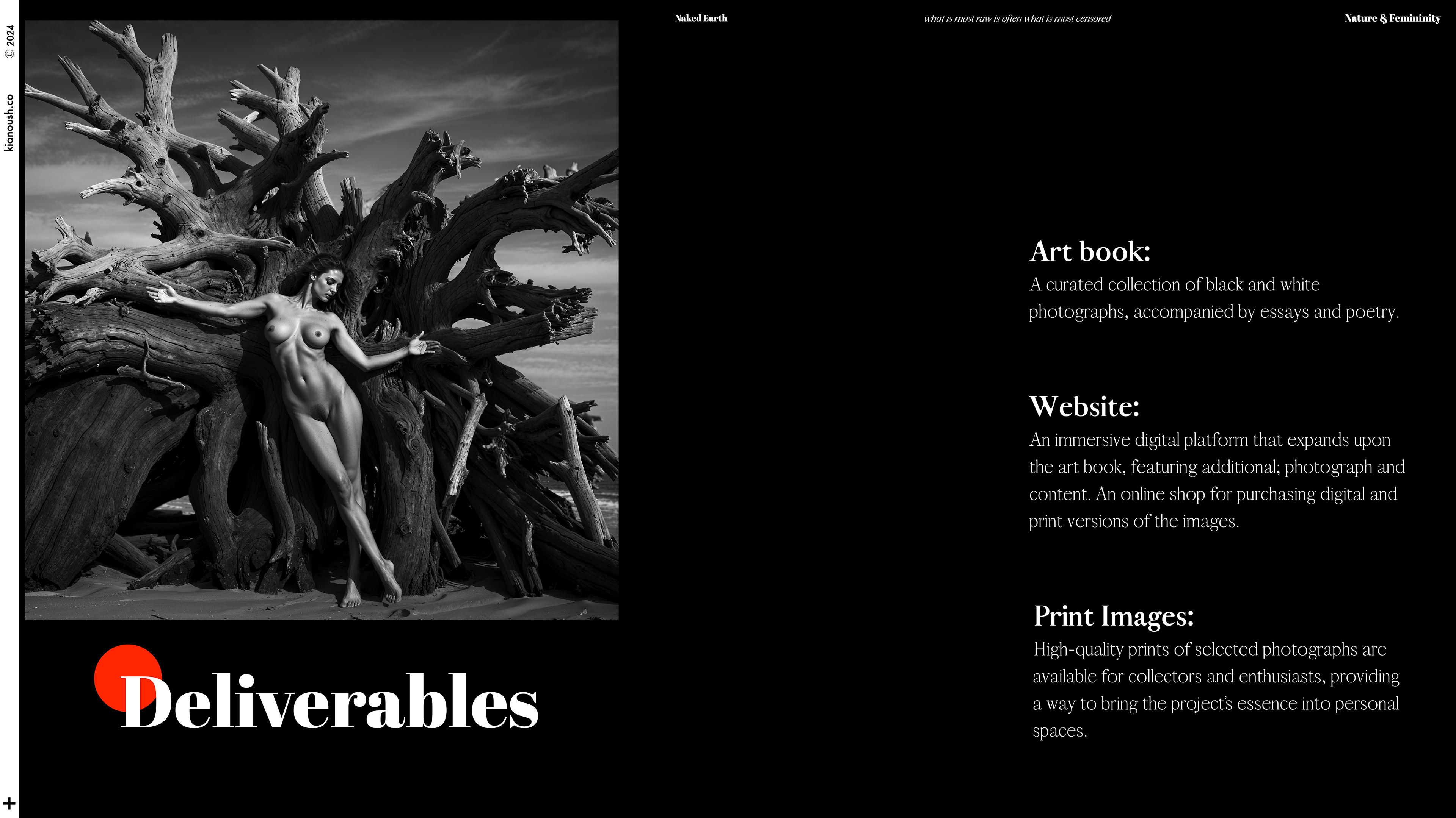 Naked Earth is a multifaceted artistic endeavor that delves into the symbolic relationship between the female form and untouched natural environments. Through a series of black and white nude art photographs, the project celebrates the raw beauty, vulnerability, and strength found at the intersection of femininity and nature. The deliverables include an art book, a comprehensive website, and a collection of print images.